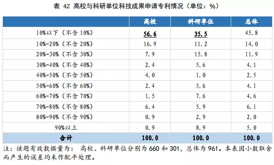 《报告》显示,高校与科研单位科技成果申请专利的比例较低,科技成果申请专利比例在10%以下的专利权人分别在高校和科研单位中占比 56.6%和 35.5%。