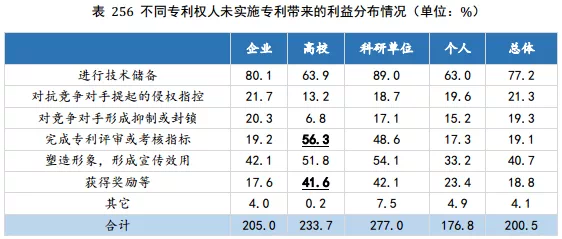 有 56.3%的高校表示没有实施的专利被用以完成专利评审或考核指标;41.6%的高校利用没有实施的专利获得奖励等,远超企业相应占比,高校专利布局目的受政策因素的影响过高。
