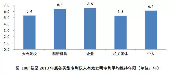 近年来,我国国内有效发明专利平均维持年限缓慢提高,由 2015 年的 5.8年提高到 2018 年的 6.3 年。而 2018 年,国外在华有效发明专利平均维持年限为9.7 年,较国内有效发明专利平均维持年限高出 3.4 年。从专利权人类型看,截至 2018 年底企业有效发明专利平均维持年限为 6.5年,相对较高,而大专院校为 5.4 年,相对较低。