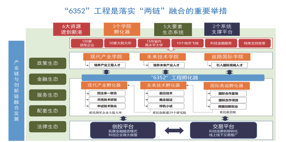 什么是“6352”工程?就是致力于汇聚“政产学研用金”六种要素,建设现代产业学院、未来技术学院、丝路国际学院三大孵化器,打造政策、金融、服务、配套、知识产权法务,构筑有利于创新创业的五个生态环境,建成创业投资、成果交易两大支撑平台。